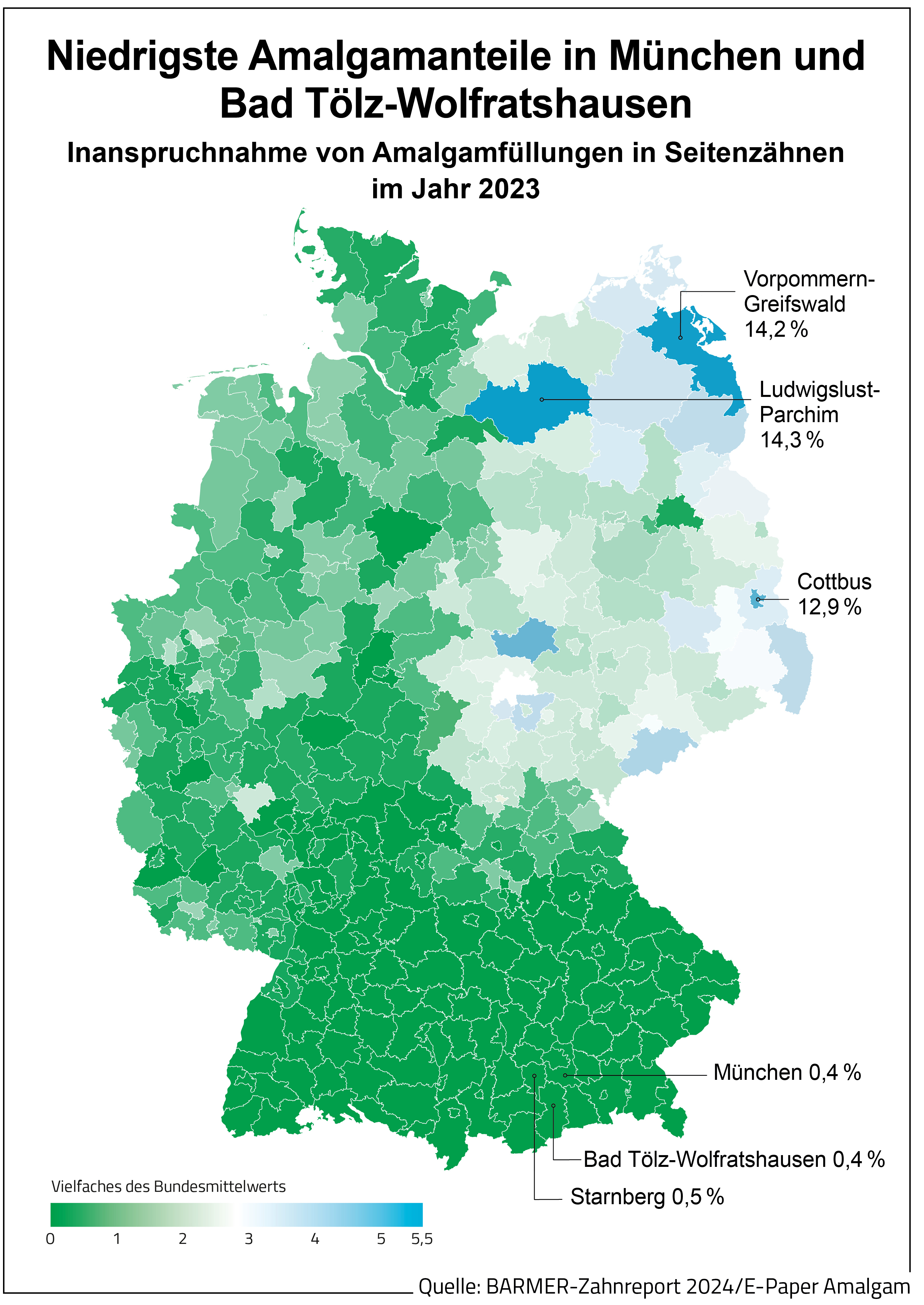 Berlin, 29. November 2024 – Jede neunte Person in Mecklenburg-Vorpommern erhält bei schadhaften Seitenzähnen eine Amalgamfüllung, in Baden-Württemberg hingegen nur jede 83. Das geht aus einer aktuellen Auswertung des BARMER-Zahnreports hervor, die vor dem Hintergrund des Amalgamverbots der Europäischen Union ab Januar 2025 erarbeitet wurde. Demnach gibt es nach wie vor große regionale Unterschiede beim Einsatz von Amalgam. Die niedrigsten Amalgamanteile bei der Inanspruchnahme von Seitenzahnfüllungen gab es im Jahr 2023 in Baden-Württemberg, Bayern und Hessen mit rund 1,2 beziehungsweise 1,3 und 1,9 Prozent. Spitzenreiter sind Brandenburg, Sachsen und Mecklenburg-Vorpommern mit 8,3 beziehungsweise 8,7 und 11,2 Prozent. „Im Interesse der Versicherten sind vor allem qualitativ hochwertige, zuzahlungsfreie Alternativen für Amalgam als Füllungswerkstoff wichtig. Eine Grundlage dafür ist die von Kassenzahnärztlicher Bundesvereinigung und GKV-Spitzenverband kürzlich erarbeitete Regelung“, sagt der Vorstandsvorsitzende der BARMER, Prof. Dr. med. Christoph Straub. Jedoch müsse der neue gesetzliche Anspruch auf eine zuzahlungsfreie Versorgung ohne Amalgam in den Praxen klar und unmissverständlich kommuniziert werden.