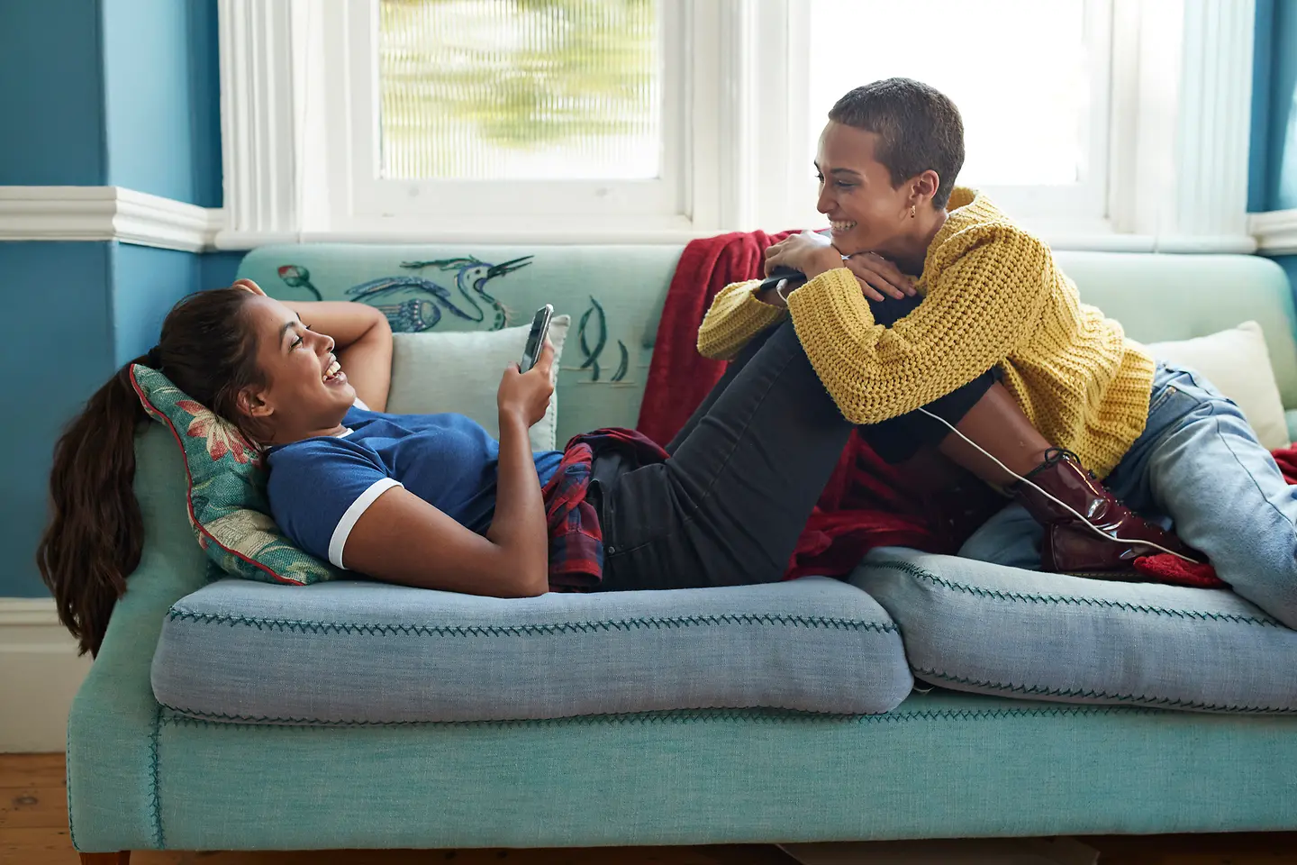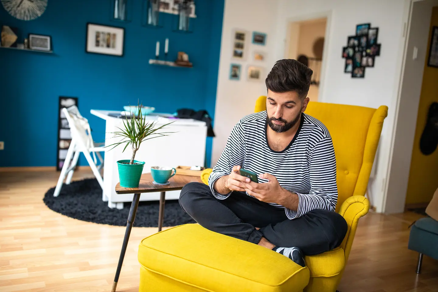 Eine Frau sitzt auf dem Bett und schaut auf ihr Handy.