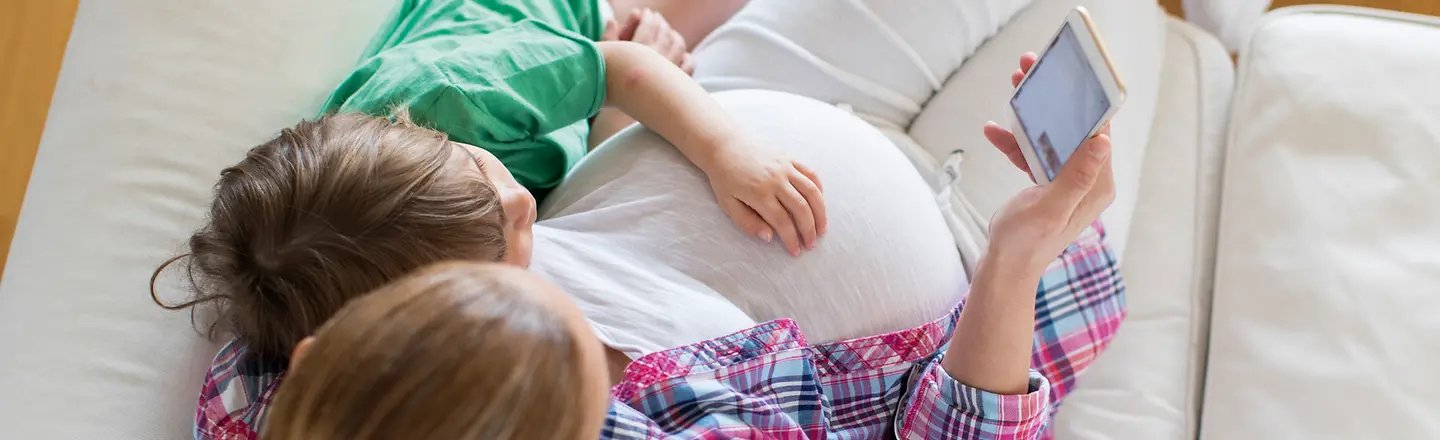 Eine schwangere Frau sitzt mit einem Kind auf einem Sofa