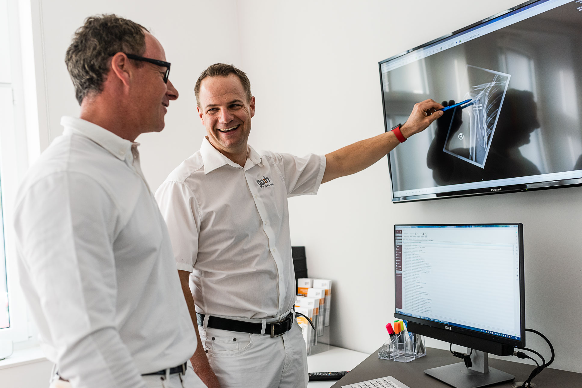 Viele Patienten die zur go:hkommen, bringen bereits Röntgen- oder MRT-Bilder mit, nehmen verschiedene Medikamente ein, haben bereits eine physiotherapeutische Behandlung hinter sich oder sind vielleicht bereits in der Vergangenheit operiert worden. Trotzdem wird jeder Patient ausführlich zur Vorgeschichte befragt: Welche Beschwerden bestehen? Wie lange bestehen die Beschwerden? Bei welchen Tätigkeiten tut es besonders weh, in welchen Situationen wird es besser? Im zweiten Schritt folgt dann eine umfassende klinische Untersuchung. Die Klinik führt standardisierte Bewegungs-, Kraft-und Schmerztests durch um zu sehen ob die Schmerzen zu einem bestimmten Krankheitsbild passen. Der dritte Schritt ist dann die Auswertung und Analyse der Röntgen-, MRT- und CT-Bilder.