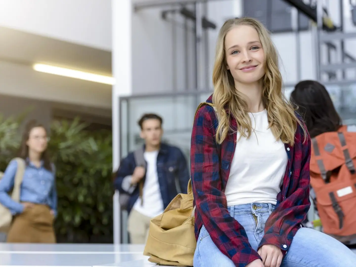 Zu sehen ist ein Mädchen, das vor einer Schule sitzt