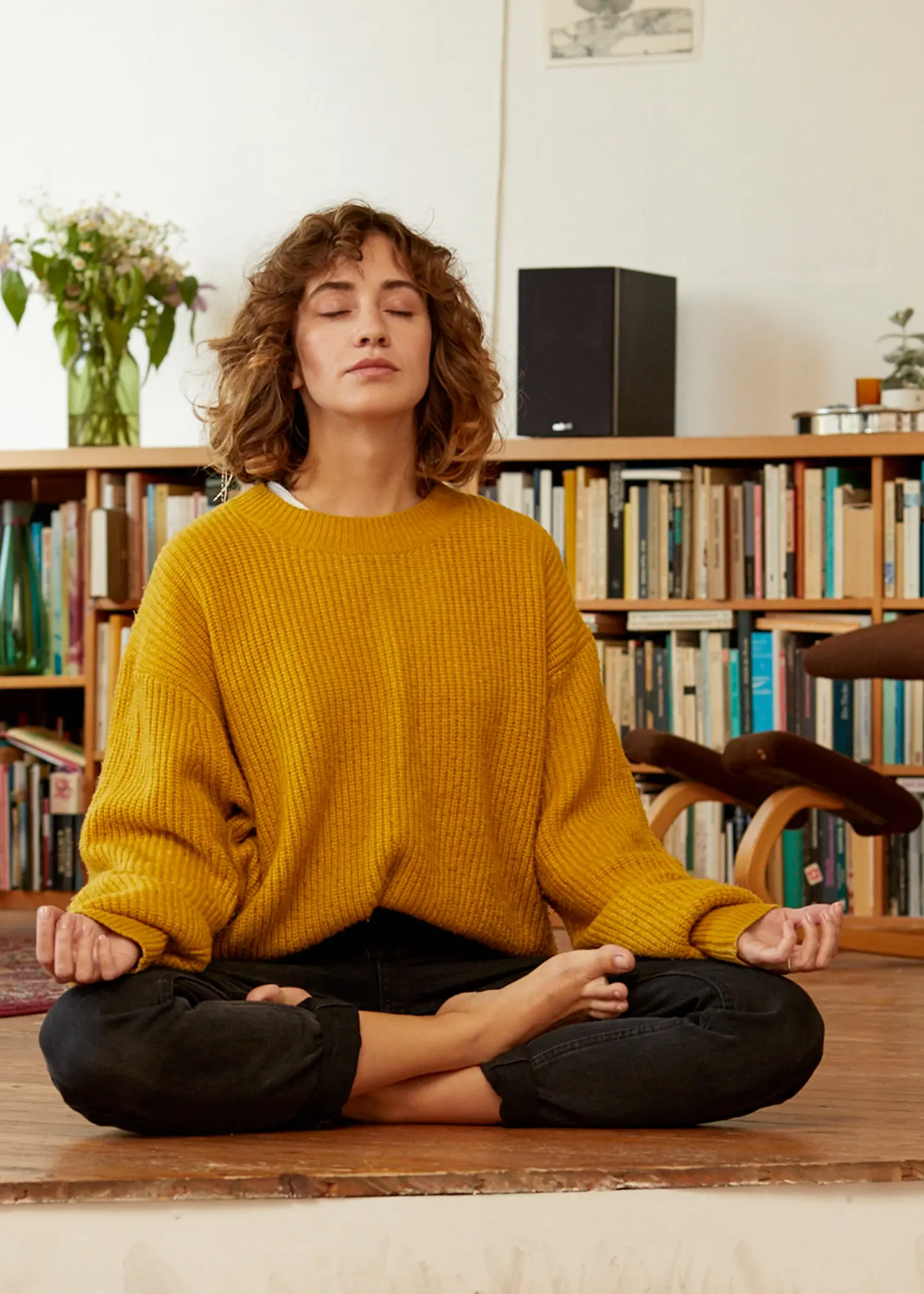 Frau sitzt vor dem Sofa und entspannt sich