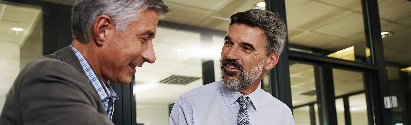 Zwei Männer mit Anzug und Kravatte stehen an einem Tisch im Büro und sind im Gespräch