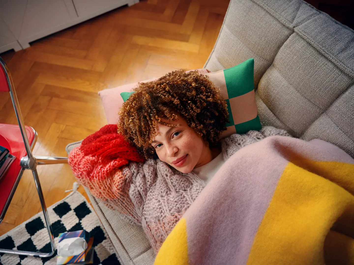 Eine Frau liegt angeschlagen auf ihrem Sofa.