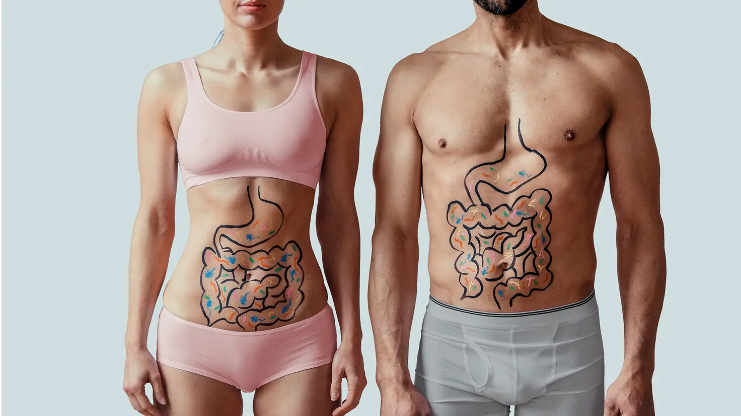 Eine Frau und ein Mann mit Zeichnung eines Darms auf dem Bauch