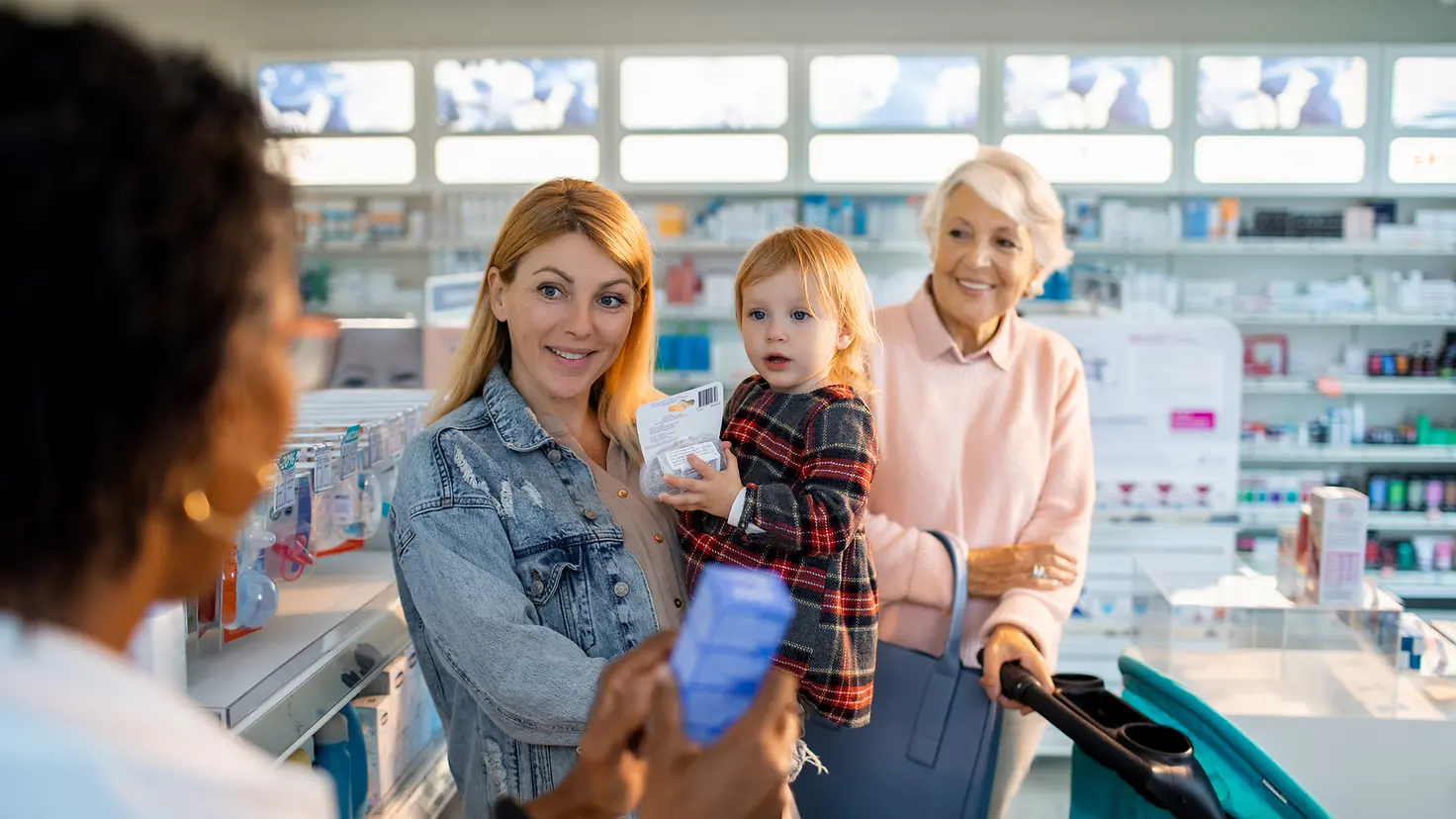Eine Mutter mit Kind und Oma kaufen in der Apotheke ein Medikament
