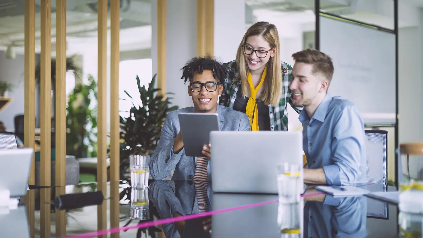 Zwei Männer und eine Frau im Büro blicken auf einen Monitor