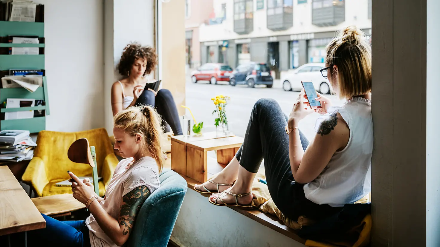Drei junge Frauen sitzen mit ihren Smartphones in einem Café