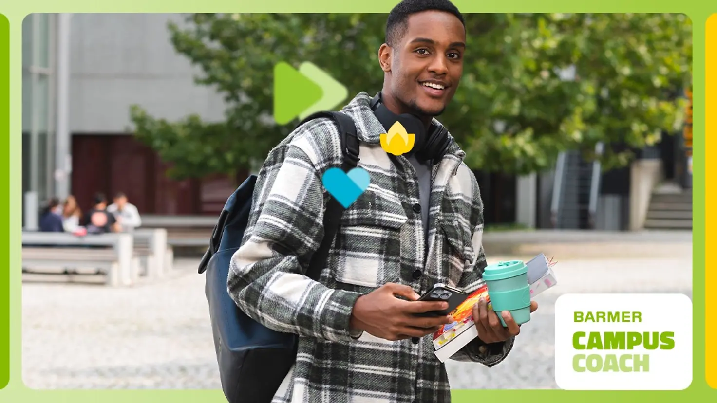 Zwischen Hörsaal, Seminararbeiten, Lernstress, Nebenjob und Hobbys auch noch auf die Gesundheit zu achten, ist nicht immer einfach. Auf der Barmer Campus Coach-Plattform finden Studierende unter anderem Meditations- und Fitness-Übungen, gesunde und leckere Rezeptideen, Lernmethoden, Tipps für die Alltagsorganisation sowie Angebote für die mentale Gesundheit. Der Campus Coach hilft ihnen dabei, entspannt und gesund durchs Studium zu kommen.