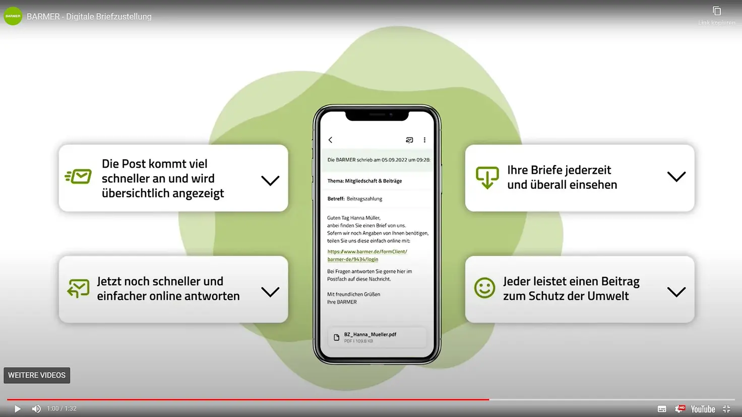 Statt wie jedes Jahr 40 Millionen Briefe verschickt die Barmer jetzt digitale Post an alle Versicherten, die dies wünschen. Um Papier zu sparen und unser Klima und unsere Umwelt zu schonen haben wir seit Juli 2022 die digitale Briefzustellung eingeführt. Doch Nachhaltigkeit ist nur eines von vielen Argumenten, die dafür sprechen. Die Digitale Briefzustellung organisiert sich fast von selbst, ist barrierefrei und spart neben Papier auch Zeit und Porto. Über 845.000 Barmer-Versicherte haben sie bereits in der Barmer-App oder im Kundenportal Meine Barmer aktiviert. Statt zum Briefkasten zu gehen, schauen sie einfach in die App. Denn sie erhalten ihre Barmer-Briefe direkt ins digitale Postfach. Per E-Mail oder SMS lassen sie sich dann ganz bequem über neue Nachrichten informieren und können digital antworten. Weitere Informationen und wie auch Sie die digitale Briefzustellung nutzen können.