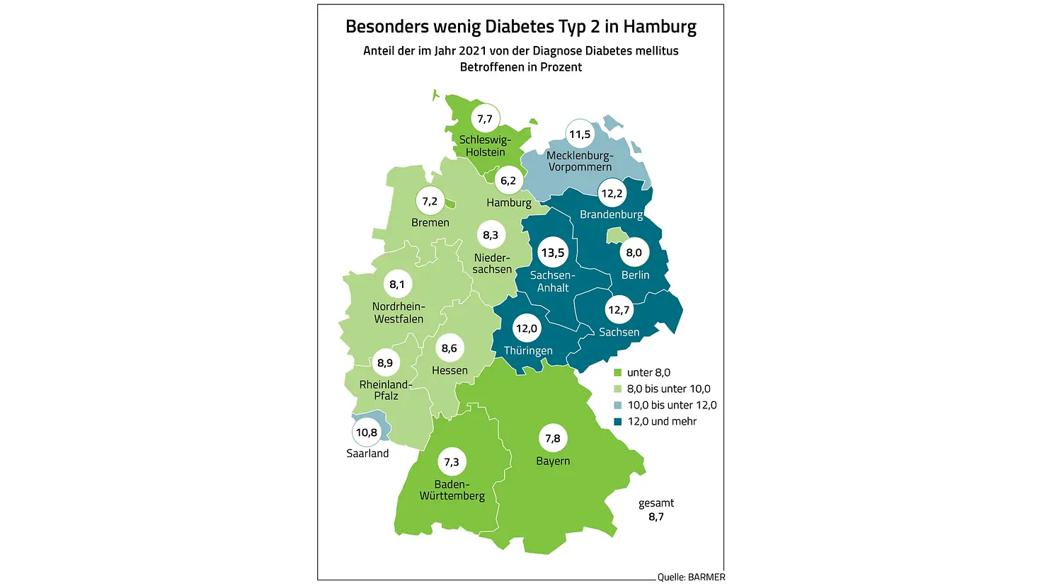 Bundesweit leiden den Versorgungsdaten der Barmer zufolge rund 7,2 Millionen Menschen und damit 8,7 Prozent der Bevölkerung an Diabetes mellitus Typ 2. Das entspricht einem Anstieg von etwa 18 Prozent in zehn Jahren. Der interaktive Diabetes-Atlas bringt dabei Transparenz in die Verteilungen der Krankheitslast nach Bundesländern, Altersgruppen, Geschlecht und Jahr.