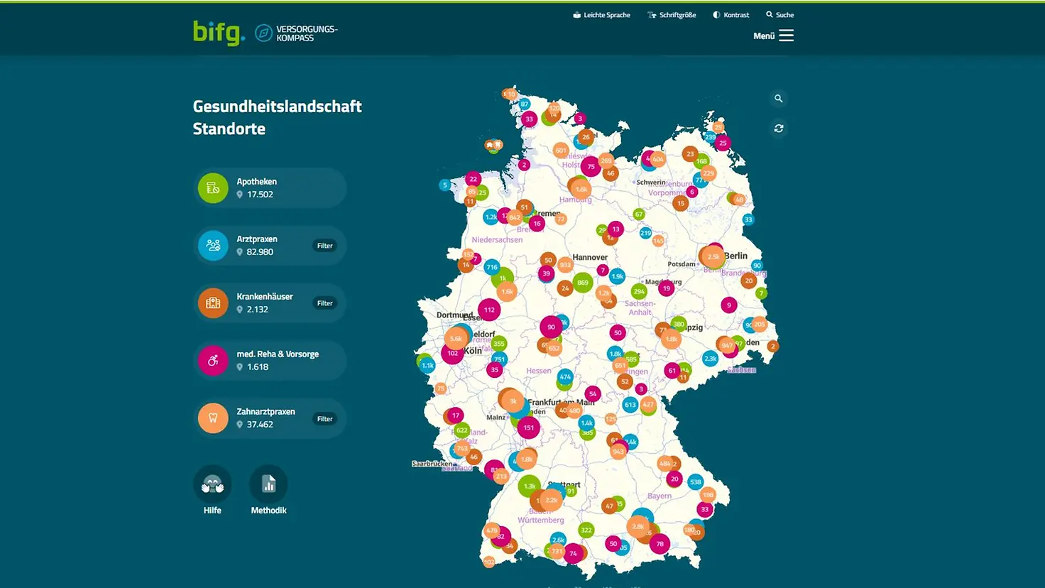 Auf der Karte lassen sich über 80.000 Arztpraxen, 2.000 Krankenhäuser und 17.000 Apotheken differenziert darstellen und analysieren. Filter nach Fachrichtungen, Bettenklassen oder Versorgungsdichte erlauben tiefergehende Einsichten. Jetzt Online-Portal entdecken