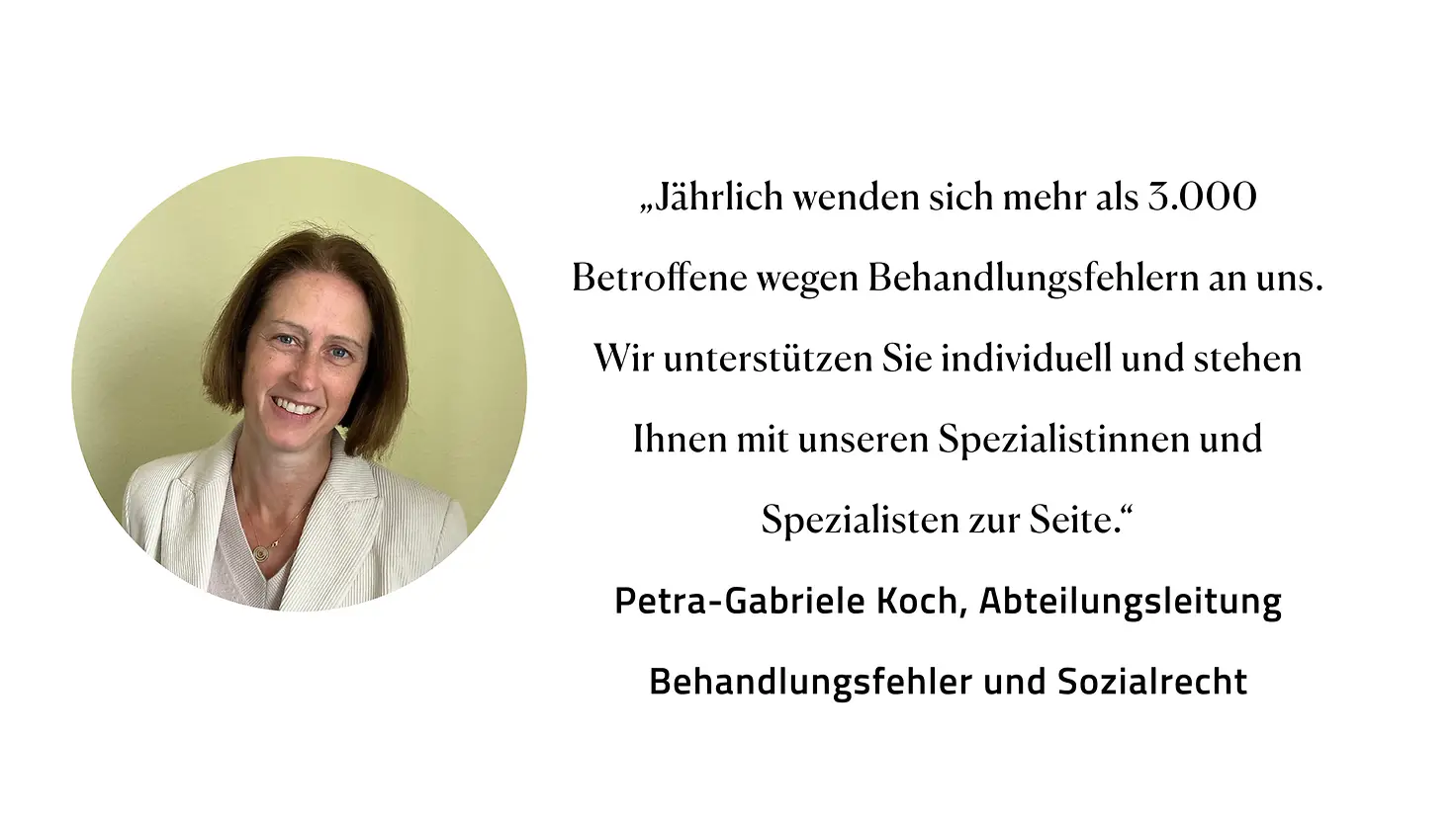 Unsere Versicherten stehen bei der Klärung von Behandlungsfehlern immer im Fokus. Dabei profitieren Sie von der langjährigen Erfahrung unserer Spezialistinnen und Spezialisten. Dieses Wissen sowie die Erwartungen und Bedürfnisse der Betroffenen haben wir intern intensiv beleuchtet und zusammenfließen lassen. Durch unseren so neu erarbeiteten Beratungsprozess können unsere Versicherten noch individueller und intensiver von unserer Unterstützung profitieren und zu jedem Zeitpunkt die bestmögliche Beratung erfahren.
