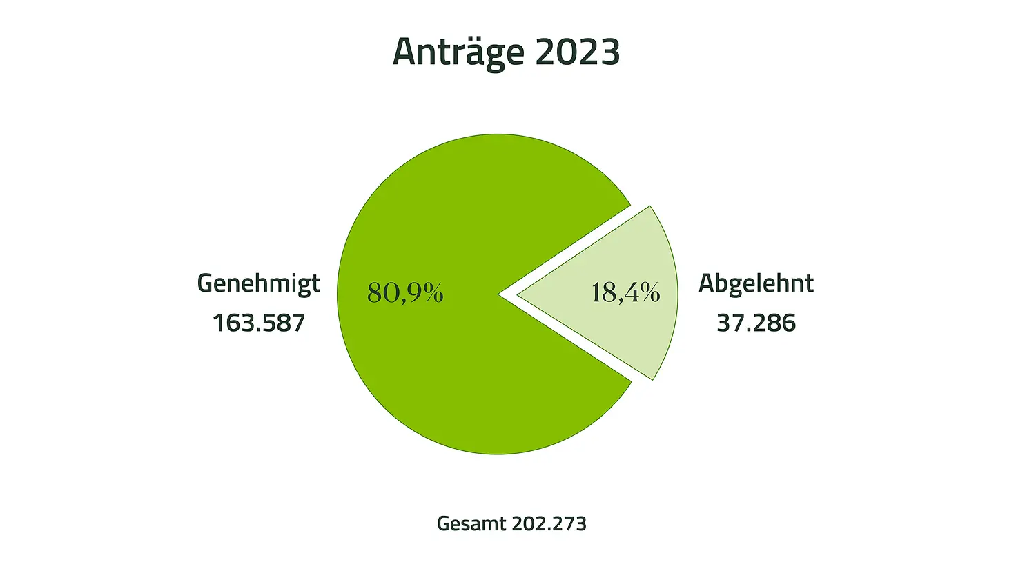 163.587 (80,9%) im Berichtsjahr erledigte Anträge auf Feststellung von Pflegebedürftigkeit, die zur Anerkennung von Pflegebedürftigkeit mit einem der Pflegegrade 1 bis 5 geführt haben.