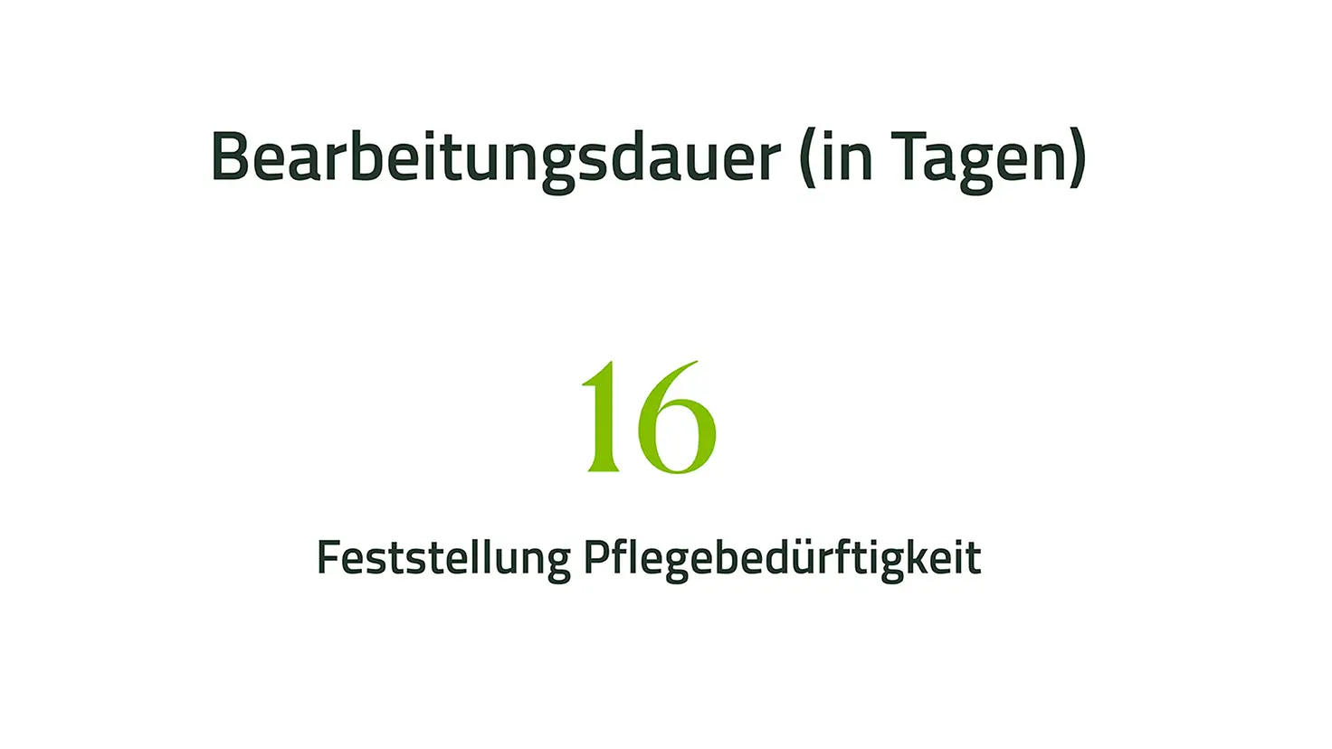 Den Pflegegrad beurteilt der Medizinische Dienst – meist bei einem persönlichen Besuch. Das braucht etwas Zeit. Die Barmer Pflegekasse entscheidet über Pflegeanträge dennoch innerhalb von 25 Arbeitstagen, meist sogar schneller. Im Durchschnitt benötigt die Barmer Pflegekasse 16 Tage für die Bearbeitung.